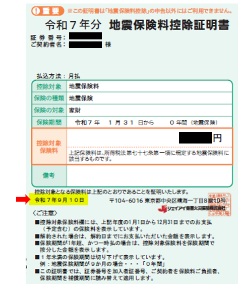 ・この場合は、ハガキの中面「令和■年分 地震保険料控除証明書」の中段あたりに記載されている「当社が控除対象となる保険料を証明した年月日」が、新しい方のハガキを使用してください。